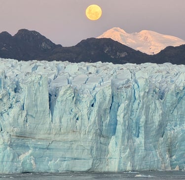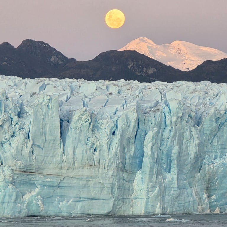 From here, we continued our voyage into the mesmerizing Chilean fjords. Each fjord is a unique ecosystem, characterized by towering cliffs and rich marine life. It was here that we took an early morning Zodiac ride and were entertained by a pod of Peale's dolphins surfing off of our bow and the odd visit from a curious South American sea lion. The birdlife here was quite unique also. Crested Cara Caras, Imperial Cormorants and South American Terns filled the skies. As sunset approached we made our way to Eyre Fjord, the home of the massive Pío XI Glacier. Spanning an impressive 1,265 km², this glacier is not just the largest in South America, but also a stunning example of nature’s power, originating from the vast Southern Patagonia Ice Fields. It stands an impressive 15 storeys tall and spans a 5km width. Just as night fell, we were treated with an amazing sight as the Super Moon appeared over the glacier. What an amazing end to an extraordinary day!
